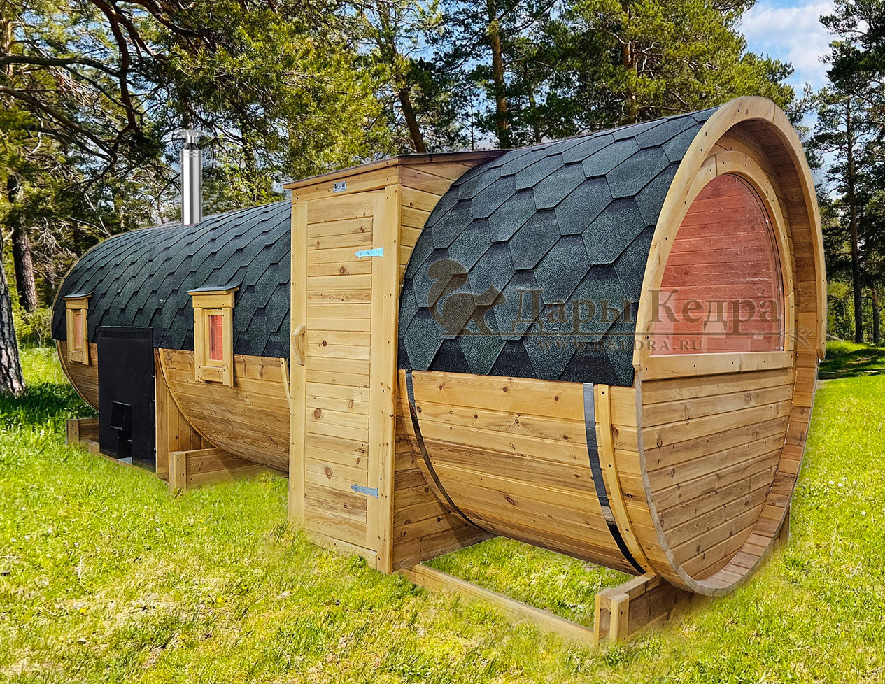 • Баня-бочка круглая из кедра 2 метра Это изделие круглой вытянутой формы с одним парильным отделением. Внутреннее пространство включает в себя печь у дальней стены и лавки из кедра по обе стороны бани. За счет компактной формы баня нагревается в течение 30 минут. По вашему желанию ее можно укомплектовать козырьком, верандой и печью с внешней загрузкой, благодаря которой весь мусор после топки остается на улице. Круглая баня-бочка не требует полноценный фундамент, поэтому при необходимости ее можно перенести в другое место. Обращаем Ваше внимание, что в стандартную комплектацию бани входят лавки в парной с обеих сторон. Дополнительно можно заказать полок открытого или закрытого типа! Кедр обладает ароматическими свойствами. Он не деформируется и влагоустойчив, при правильном уходе за деревом на нем не развиваются грибки и плесень.