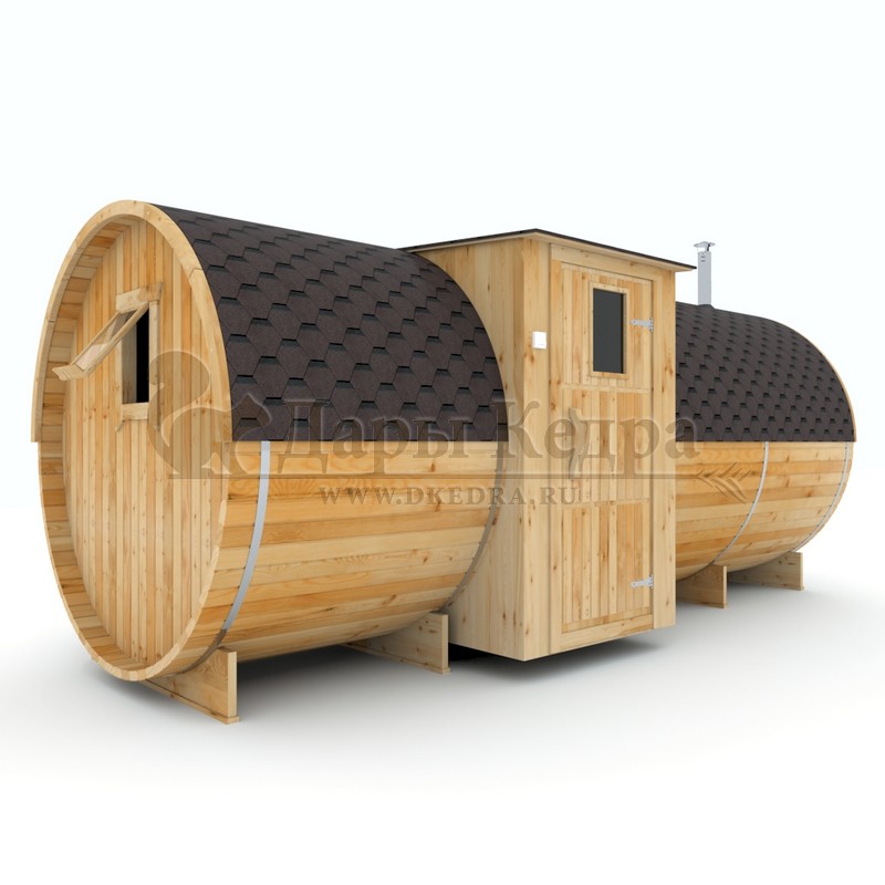 Баня-бочка круглая из кедра 6 метров Это изделие круглой вытянутой формы с тремя отделениями: раздевалкой, моечной и парной. Во всех трех отделениях с обеих сторон установлены лавочки из кедра. Печь находится в парилке около дальней стены. Для удобства пользования в бане висят полочки из кедра и вешалка в раздевалке. Время растопки такой бани не превышает 30 минут. По вашему желанию баню-бочку можно дополнить печью с внешней загрузкой, благодаря которой весь мусор после топки останется на улице. Круглая баня-бочка не требует полноценный фундамент, поэтому при необходимости ее можно перенести в другое место. Обращаем Ваше внимание, что в стандартную комплектацию бани входят лавки в парной с обеих сторон. Дополнительно можно заказать полок открытого или закрытого типа! Кедр обладает ароматическими свойствами. Он не деформируется и влагоустойчив, при правильном уходе за деревом на нем не развиваются грибки и плесень.
