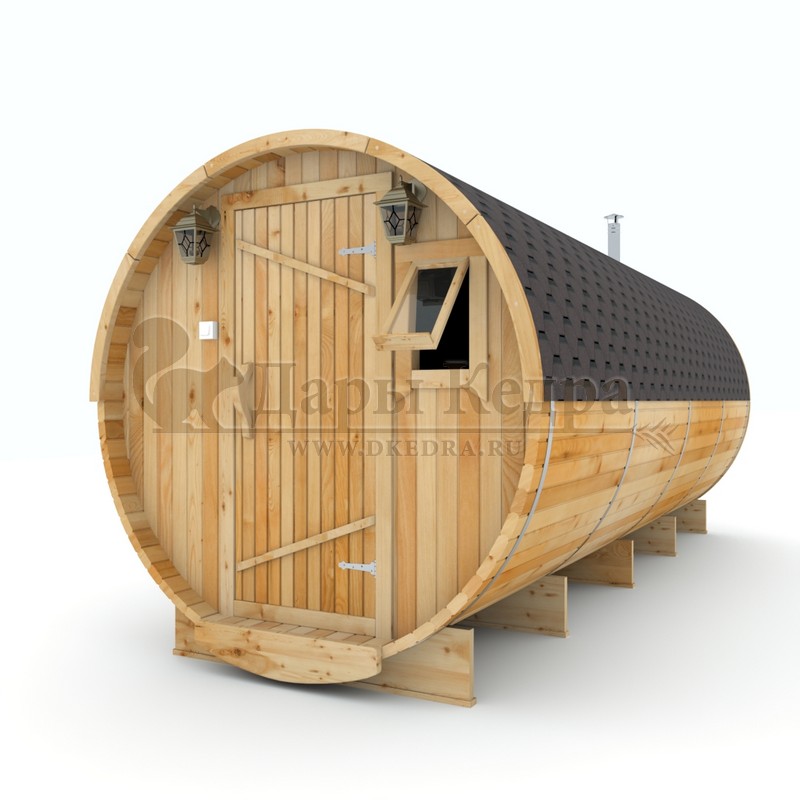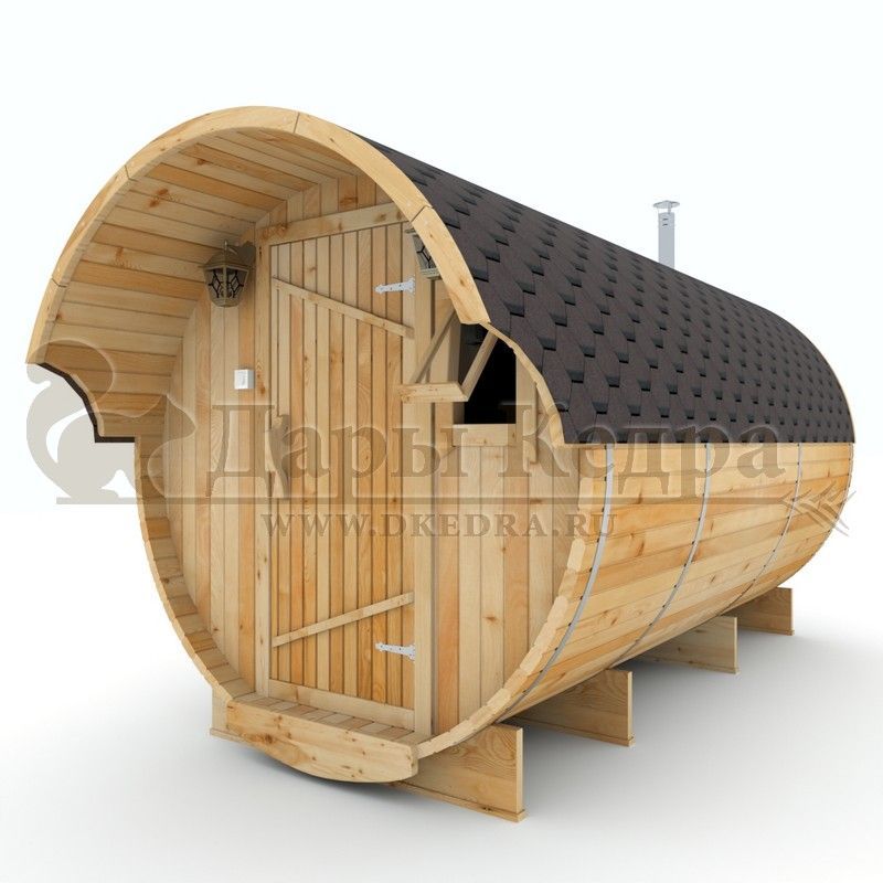 Баня-бочка круглая из кедра с козырьком (все размеры) Это изделие круглой вытянутой формы. Козырек не только украшает баню, но и защищает оставленную обувь от дождя. Лавочки из кедра находятся по всей длине бани-бочки с обеих сторон. Печь расположена в парилке около дальней стены. Время растопки такой печи не превышает 30 минут. В зависимости от выбранного размера круглая баня-бочка с козырьком имеет следующую комплектацию: Круглая баня-бочка 2,5 метра - парилка; Круглая баня-бочка 3,5 и 4,5 метра - раздевалка, парилка; Круглая баня-бочка 5,5 метров - раздевалка, парилка, моечная. По вашему желанию ее можно укомплектовать печью с внешней загрузкой, благодаря которой весь мусор вовремя топки остается на улице. Круглая баня-бочка не требует полноценный фундамент, поэтому при необходимости ее можно перенести в другое место. Обращаем Ваше внимание, что в стандартную комплектацию бани входят лавки в парной с обеих сторон. Дополнительно можно заказать полок открытого или закрытого типа! Кедр обладает ароматическими свойствами. Он не деформируется и влагоустойчив, при правильном уходе за деревом на нем не развиваются грибки и плесень.