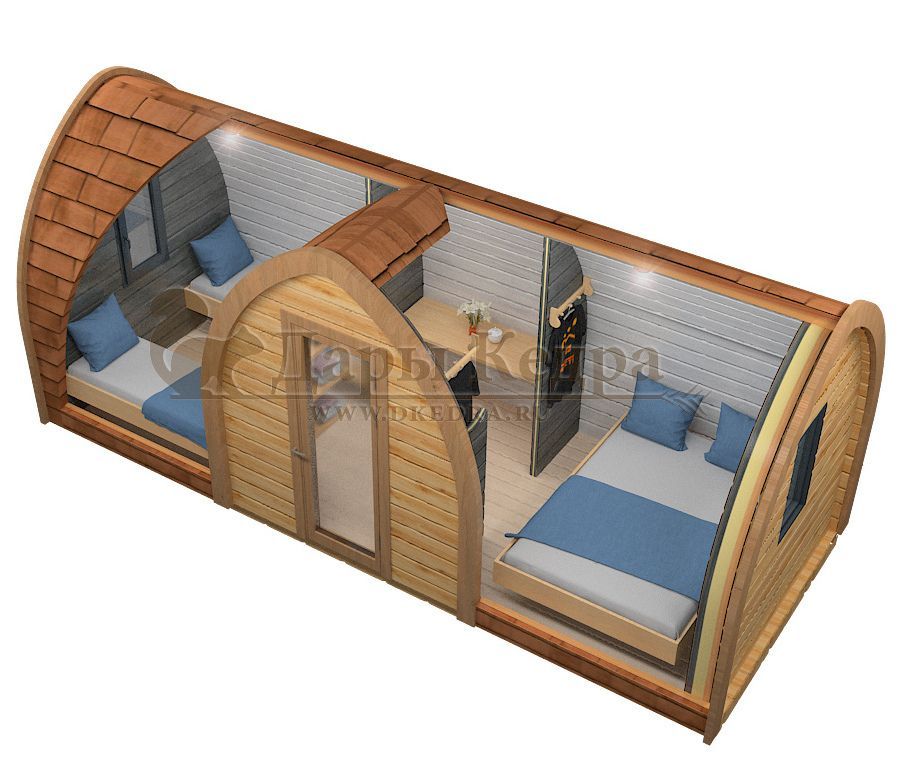 • Кемпинг дом «Викинг» Экологичный утепленный дом 'Викинг' подходит для постоянного проживания на даче или для обустройства загородных баз отдыха. Оригинальная модель включает два помещения и позволяет рационально использовать внутреннее пространство. Кемпинг-дом предполагает два варианта размещения: Прихожая и комната со спальным местом; Комната со спальным местом и сауна с парилкой. Утепленный пол с покрытием (ламинат), пароизоляция под кровлей, панорамные окна, современная сантехника сделают пребывание на природе комфортным и безопасным круглый год.