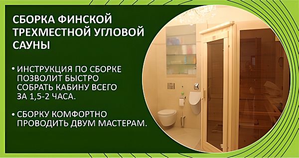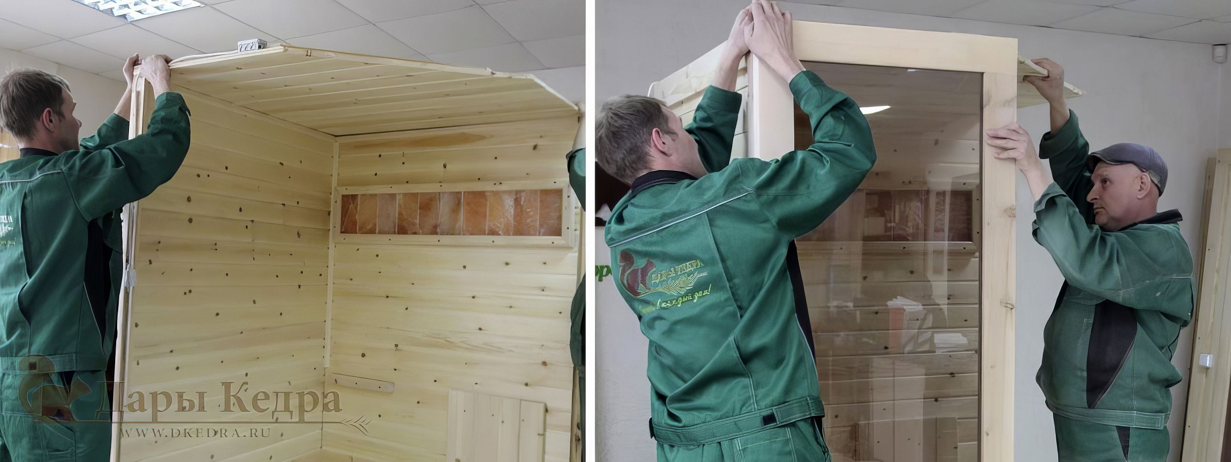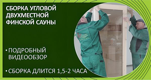 Заключительным этапом будет установка дверных ручек с обеих сторон, светильника, абажура и заглушек по всей поверхности сауны. В среднем на сборку финской кабины потребуется 1-3 часа в зависимости от мастерства сборщиков и технических параметров изделия. Наглядная инструкция по сборке двухместных саун показана ниже на видео. По аналогичной схеме собираются и другие кабины (одно-, трёх-пятиместные).