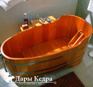 - Кедр не зря используют при судостроительстве. Древесина твёрдой породы отличается красивой структурой и благородным оттенком. Она не подвержена гниению, выдерживает долгое воздействие влаги и температуры. Практически не даёт усадки, не коробится и не трескается. Поэтому ванна при правильном уходе прослужит вам много лет.