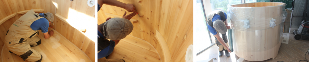 8. Оставить купель до полного высыхания на 3 часа. После этого необходимо снять стяжные фиксирующие ремни и пленку. В местах склейки внутри и снаружи при необходимости убрать концелярским ножом остатки клея PUR, зашлифовать и нанести защитное покрытие, если изначально им была пропитана купель. И далее снова нанести пленку на изделие.